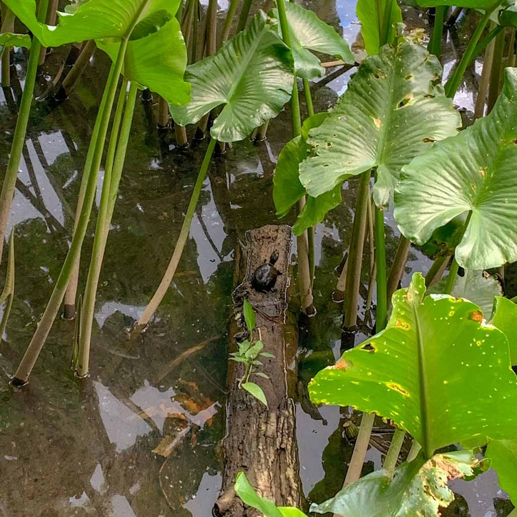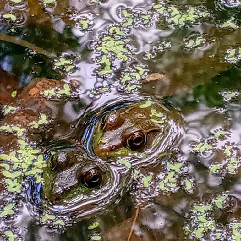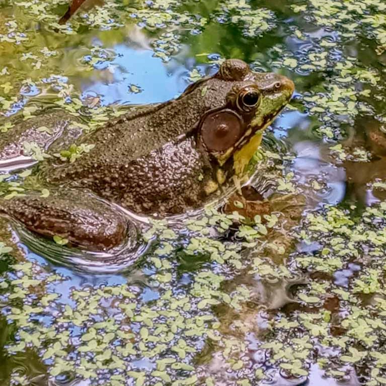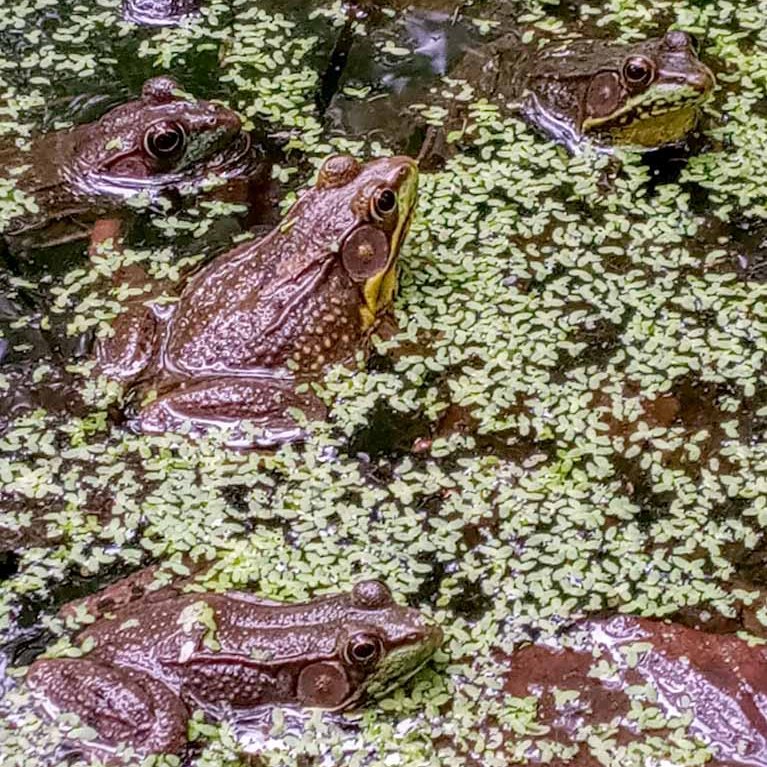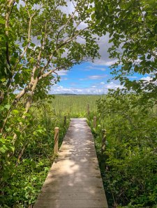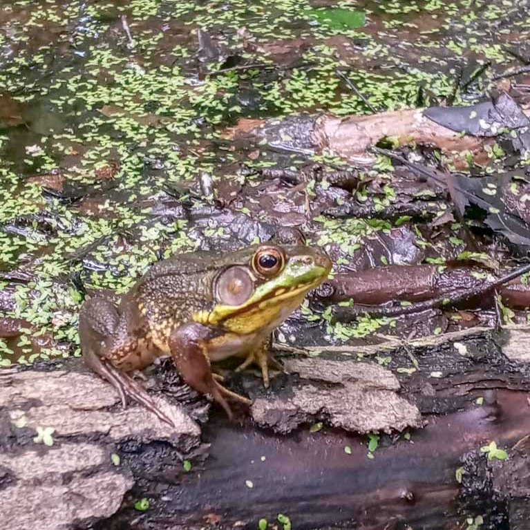 We’ve done several different trail combos at Juy Bay but no matter where we trek, we always have to go on the boardwalk overlooking the river wetlands and we also have to visit Mark’s Pond along the Upper RR Bed Trail. It’s a small pond that is just teeming with life! We sat here for over an hour, barely talking, as we watched the animals of the pond. We were completely fascinated especially by the frogs who were in the throws of mating season, singing out their calls loudly and fighting off their competition. There were turtles lined up on logs in the sun watching the entire ordeal. To be honest, we didn’t end up getting much hiking in because we couldn’t tear ourselves away from this pond!