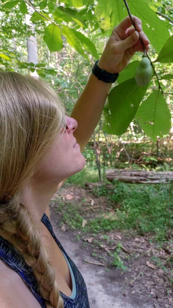 I really liked this hike because it was so peaceful. We never saw a single other person on the trail. We really turned this into a nature by testing our tree knowledge and searching for mushrooms. Sometimes I really like a hard hike and testing my limits and other days I love just wandering in the woods! J is so fascinated by nature and it never ceases to warm my heart how excited he gets over a huge tree or a tiny mushroom. The East Loop was definitely my favorite part of this hike because it followed a meandering little creek that had cut deeply into the ground, leaving really interesting patterns in the mud. BUT my absolute favorite part was [drumroll please] the Pawpaw trees!! There was an entire grove of pawpaw trees with so much fruit! It was too early to pick them yet so we just took lots of pictures but it made me so excited to see this many! I’ve been fascinated by pawpaws ever since I first heard about them and I finally got to try one a few years ago. I’ve been hoping to get my hands on some again! I think I might be coming back here later in September!