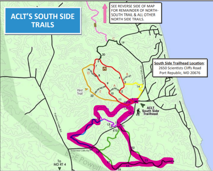 American Chestnut Land Trust is a nature reserve run by a not-for-profit of the same name and cares for over 3,500 acres. It’s split into two main sections. The north side trailhead can be accessed at 676 Double Oak Road, Prince Frederick, MD 20678 and the South Side is located at 2650 Scientists Cliffs Rd, Port Republic, MD 20676. J and I had visited the south section before and had meant to go to the North side this time but Google Maps had other ideas! We somehow ended up at the South Side trailhead anyway and decided to roll with it. There were two delightful volunteers at the trailhead who gave us advice about which trails to take and how to support the ACLT. Although there’s no fee for the trails, make sure to scan the QR code at the entrance! Visitation numbers help the ACLT get grants to continue to maintain this awesome park.