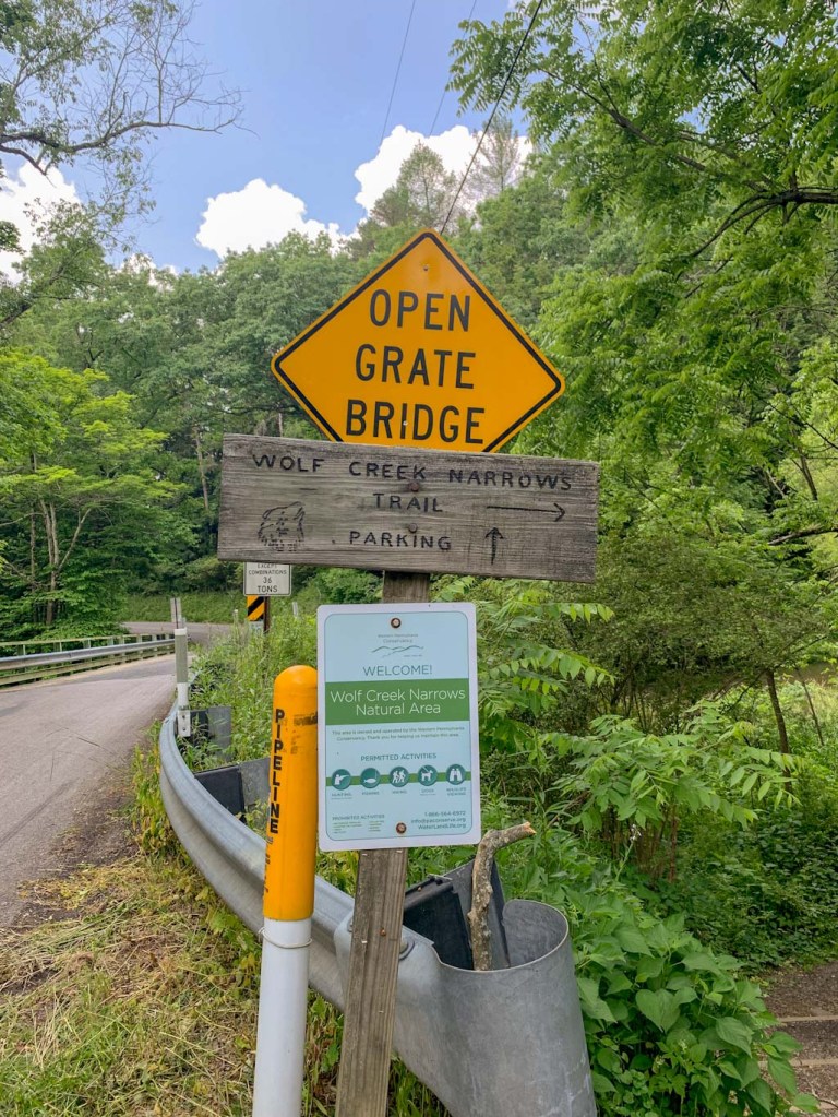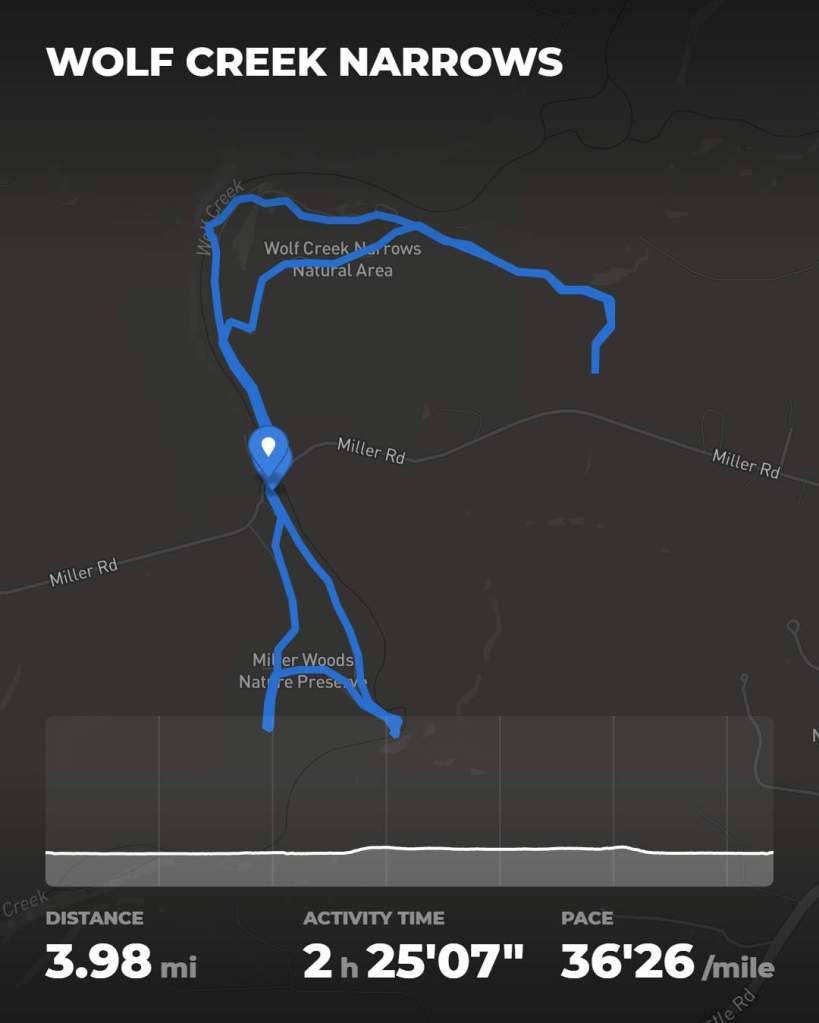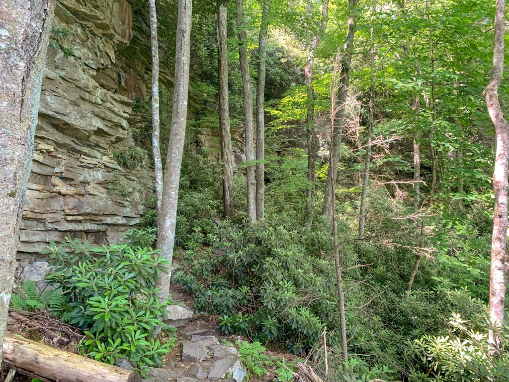 Now that you’re back at the parking lot, leave your car there and head towards the road. This isn’t a busy road, but use caution while walking along it. Make a right out of the parking lot and head across the bridge. On the left side of the bridge, you’ll see the signs for Wolf Creek Narrows. Now starts the second leg of your trek! Upon entering these woods, you’ll notice that the trees seem much older. My suggestion for this trail is to bear to the right at the first fork. There’s a short climb to higher ground and after a few minutes, you’ll see the new section of trail. This starts out in a thick hemlock patch and then opens up to a wildflower field which is also home to a bat house! Following this trail all the way to the road will lead to a new parking lot access for Wolf Creek Narrows. This is an alternative spot to park if Miller woods is full! Continue back along this trail to the woods and when you come to a fork, bear to the right to finish out the loop. After following the trail back down to the creek, be sure to spend some time down in the creek. The water is cool and refreshing and the nearby cliff sides carved out by the water are worth a look! After splashing around, follow the trail back up to the road and back to your car.