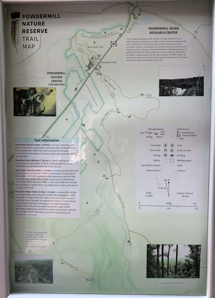 There are four parking lots to access the trails at Dead Man’s Hollow, although I suggest going to the Catfish Pond one. This is the largest lot with space for about 25 cars and is easy to access from McKeesport. After turning off Scenic Ridge Road towards the parking lot, the way is a bit rough and gravelly so be aware if you’re driving a smaller car. Take the road all the way to the end and then you’ll find the trailhead. There are kiosks with trail maps at all four parking areas, but be aware that the other three lots only have space for a few cars.