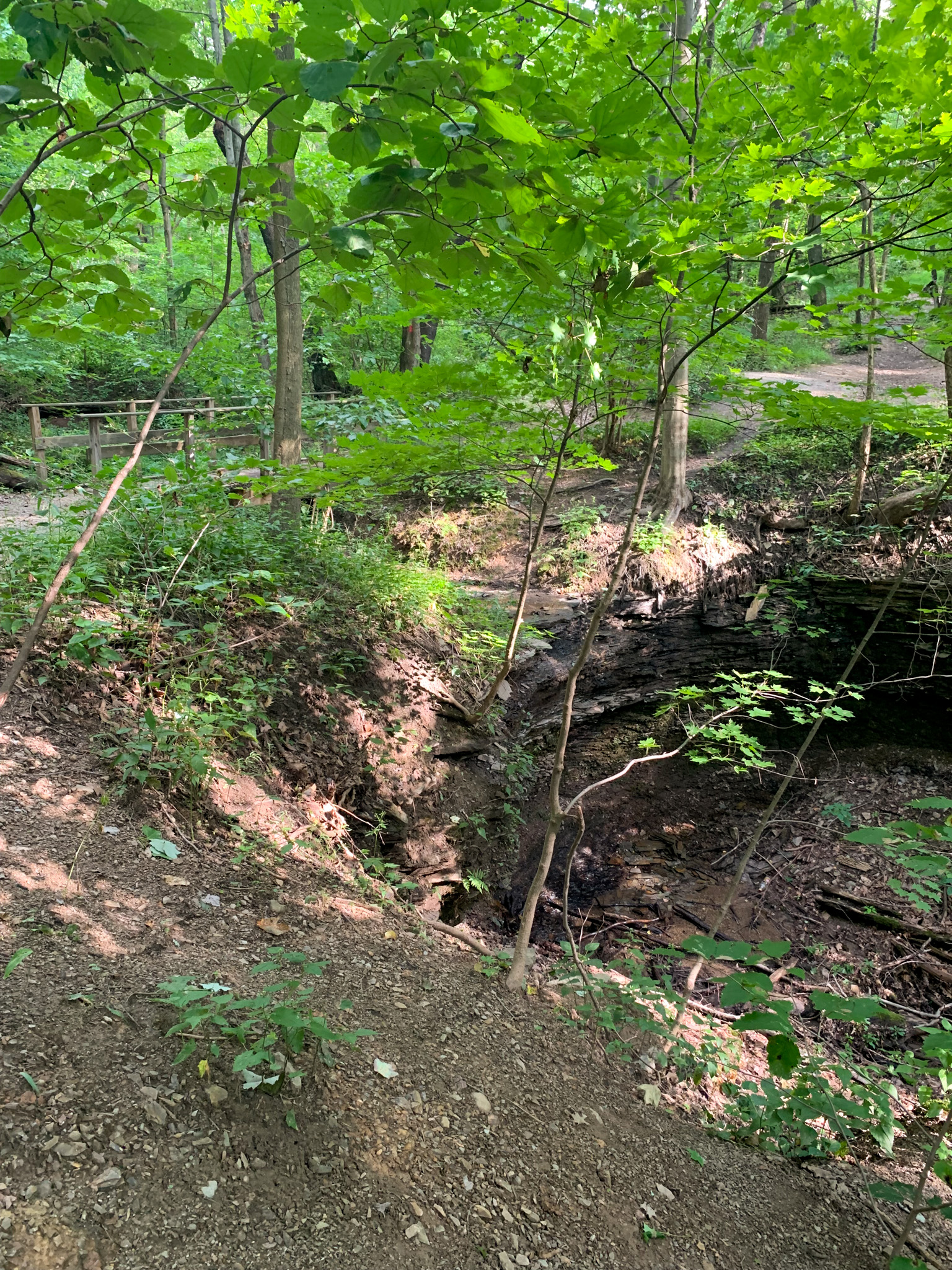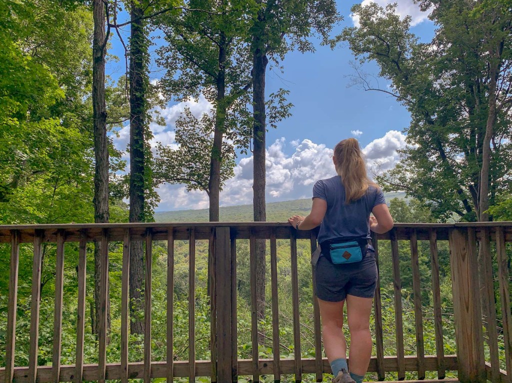We visited Dead Man’s Hollow this year as part of the Oboz Trail Experience (learn more here) so we had to take a defined route. However, I would highly suggest parking at the Catfish Pond trailhead and starting out on the red-blazed Cool Spirit Trail. Bearing to the right will lead past a small waterfall and the interesting rock feature called Table Rock. Be aware that the trail down to Table Rock isn’t well defined and is quite steep. From there, follow the purple trail down into the hollow, until it meets up with the green trai. See the towering sycamore trees and take a picture in the tree trunk hideaway. Continuing along the green trail leads to the industrial ruins and the GAP trail. From there, you can continue along the lesser trod blue trail that leads up through peaceful woods. The lower half of this trail does have a lot of broken glass though so keep an eye on your four-legged friends. My least favorite trail was the yellow trail, which was extremely overgrown past the Calhoun road parking area. I was very grateful for long pants! To connect the yellow route back to the green or the red connector, there are some very steep switchbacks up the hillside. I found these to be a fun challenge but there are definitely times when I’d rather avoid and take an easier way up.