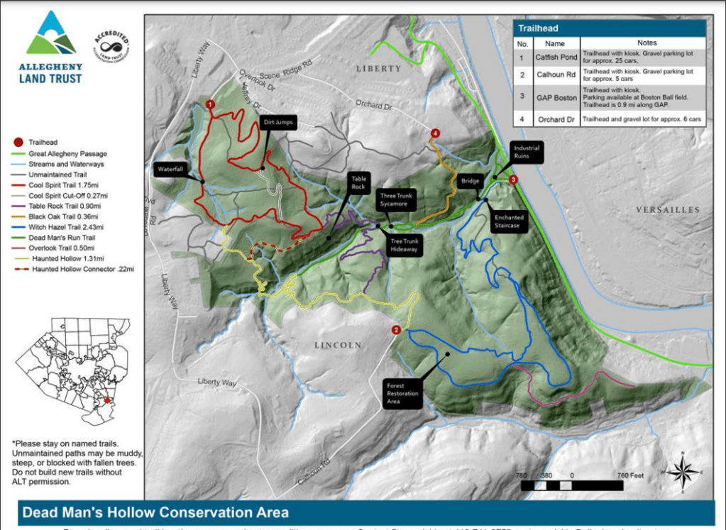 There are currently about 8 miles of trails at Dead Man’s Hollow and it links up to the Great Allegheny Passage for even more miles. The trails are open to hikers and cyclists, although be aware that some sections are very steep.